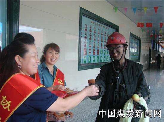 【本网讯】为了让矿工师傅过个平安的中秋节,9月5日,山西阳煤集团一矿女工委组织协管员到井口为上下班的矿工送去了平安果和月饼,另外还送去安全鞋垫,毛巾。嘱咐他们注意安全。 图为 女工给矿工师傅送月饼,苹果。