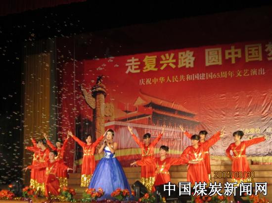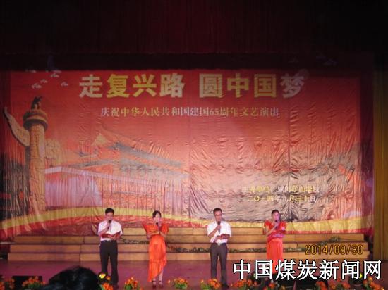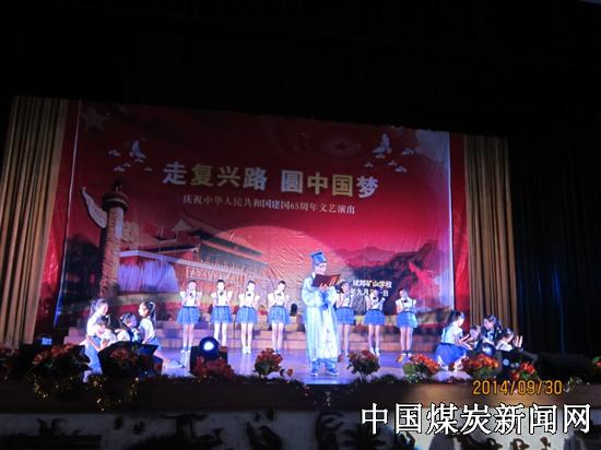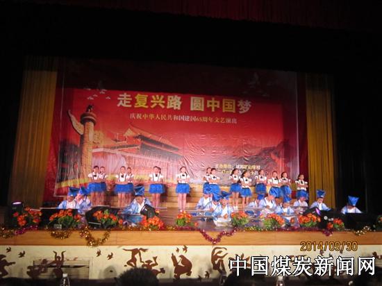 【本网讯】9月30日上午,川煤集团达竹公司斌郎煤矿演艺中心座无虚席,达州市经开区斌郎矿山学校600余名师生欢聚一堂,载歌载舞共同迎接伟大的祖国65岁生日。舞台中央“走复兴路 圆中国梦”几个大字在灯光的映衬下显得格外耀眼、夺目。达竹煤电集团斌郎煤矿领导、社会事务局领导以及经开区辖区内4所兄弟学校的校长应邀和全体师生一同观看了演出。