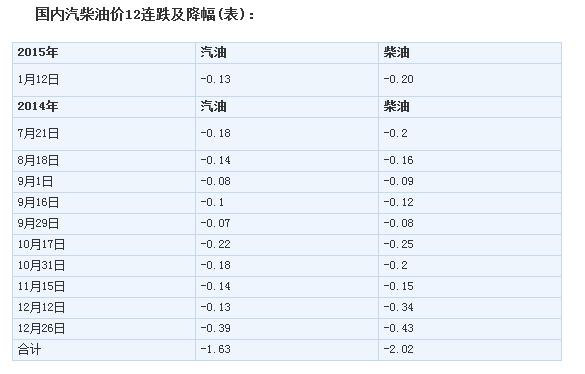 | 油价十二连跌:汽柴油每升分别降低0.13元和0.20元 | |||