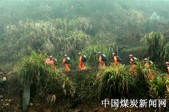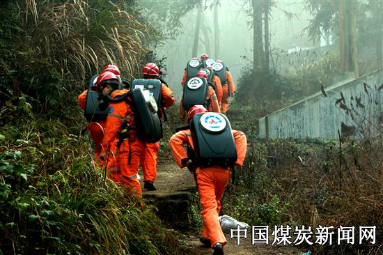 记者随队伍跟进,2015年1月15日上午,江西省矿山救护总队萍乡大队一中队在中队长带领下,组织一小队9人翻山越岭到达毛泽东、李立山等同志曾经组织工人革命活动的安源山红旗岭。一路上,队伍进行了更换呼吸器氧气瓶及故障处理等训练科目。图为队伍佩机吸氧爬山行进中。