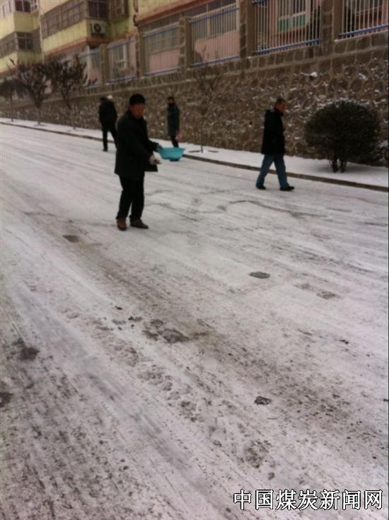 【本网讯】1月28日,2015年的第一场雪缓缓飘落,经过一晚上雨雪的沉积,28日早晨,大部分路面受到冰雪、凝冻等恶劣情况的影响,蒲白建安社区安居小区门口道路出现凝冻现象,给出行的居民造成了严重的不便,从而易引发道路交通事故。为保障有私家车的居民安全出行,在小区主任的带领下领取工业盐后,迅速组织小区员工到小区门外的道路上撒盐、铲雪,消除安全隐患,力保辖区内的道路安全畅通。