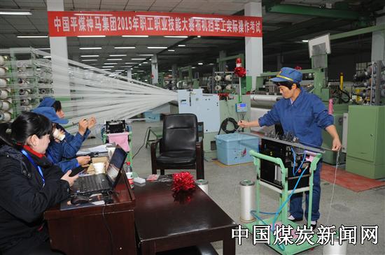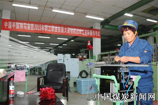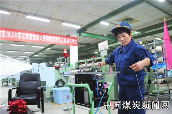 【本网讯】11月27日,中国平煤神马集团2015年职工职业技能大赛布机挡车工实际操作比赛在帘子布公司捻织二厂举行。来自各单位的15名布机挡车工参与比赛,由集团职工职业技能大赛督导组现场公布比赛成绩。图为参赛职工正在使用空气捻接器进行接头。