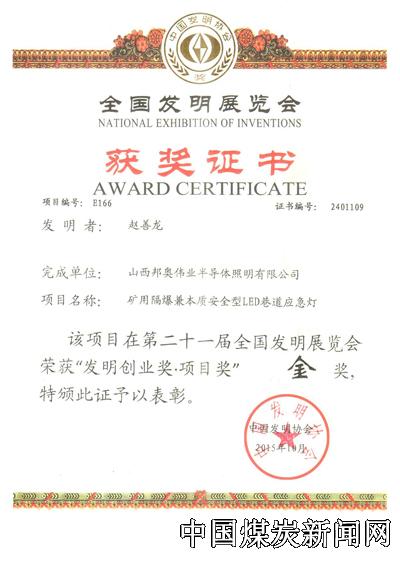 最新推出矿用隔爆兼本质安全型LED巷道应急灯和太阳能家用发电系统:矿用隔爆兼本质安全型LED巷道应急灯,属全国首创。该产品通过应急电路设计与本安控制电路设计的嵌入,达到智能控制过充电、过放电、短路保护、过流保护、反向保护的功能,实现本安输出防爆电路的设计;本质安全型电路的输出桥接方法使整灯防爆符合GB3836各项指标,产品实现常规照明和应急照明一体化结构设计,填补了矿用应急照明领域的空白,真正实现以科技引领绿色环保,以智能驱动高效节能之路,该产品在第二十一届全国发明展览会上荣获金奖。(由中国发明协会、浙江永康市人民政府主办,于2015年10月24日至27日在浙江永康国际会展中心举办,此次发明展览会以“大众创业、万众创新”为主题,设立了特邀展区和创客展区,并有项目对接、创新创业论坛、知识产权论坛等活动。) 太阳能家用发电系统,解决了目前能源匮乏、环境污染、偏远地区用电困难等问题,实现了维护方便,提高了产品的使用寿命和资源的利用率,适用于所有家用发电场所。该产品在第二十一届全国发明展览会上荣获银奖。