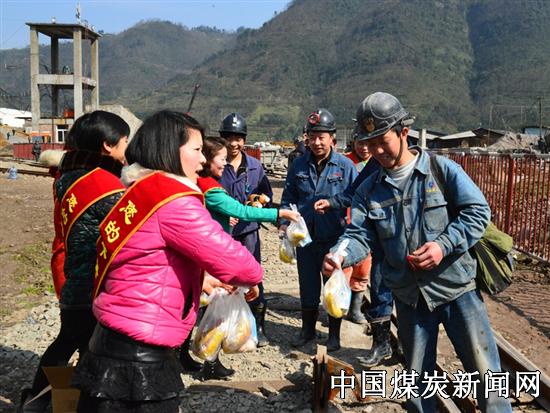 女工家属们早早在井口准备好鸡蛋、蛋糕、饮料、水果,等待入井、出井的员工,然后将一份一份小礼品送到员工手中,并叮嘱他们在工作中一定要按章操作,绝不要违章,做好自主保安和互助保安,确保节日期间平平安安,祝福全家过上安全、祥和、幸福的节日。