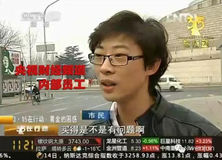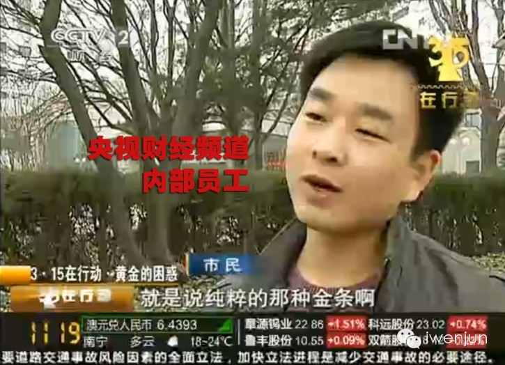 今天,3月15日,国际消费者权益日,央视财经频道播出的黄金打假新闻中,街头对市民的随机采访,其实是采访的自己内部员工,也就是俗话说的“托儿”。这节目还叫“315在行动”呢。这样的电视台,这样的新闻,谁信?