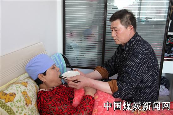 从此,年轻能干的妻子瘫痪了。曾经无数次,妻子寻死觅活不愿意在世上再拖累丈夫。王守林打掉牙齿往肚子里咽,有泪默默流。他用无微不至的照顾暖热了妻子的心房。每天早上5点就起床,给妻子熬药捏腿,做好早饭照顾妻子吃完,用两个枕头垫在她腰上,让她坐在床头,把电视打开陪伴她。在床头柜上放好饼子、泡好一保温杯茶水。等到三、四点升井下班回家,第一件事是先对妻子嘘寒问暖,然后把中药渣熬成一桶热汤水,把妻子的双腿泡在里面,王守林用毛巾沾桶里的热水不停地给妻子擦拭大腿,确保全腿的皮肤都能浸上药液。一个钟头后,桶里的水凉了就倒掉。然后开始做饭,一般仓促中做点饭自己吃,然后给妻子精心烹制绿豆稀饭、小米粥、羊肉小揪面、饺子、蒸鸡蛋糕、炖排骨等病号饭,每天都不重样,还经常给妻子买回点心、罐头、各色水果等食品,想着法子让她吃好;晚上睡觉前,天天坚持用热毛巾腾脊梁;每周为妻子洗一次澡,保持清洁卫生;平时一有空王守林就给妻子揉腿、拽腿抻筋,休息时候,他坚持架着妻子的膀子,练习走路,走一个小时歇歇,这都是为了防止肌肉萎缩。