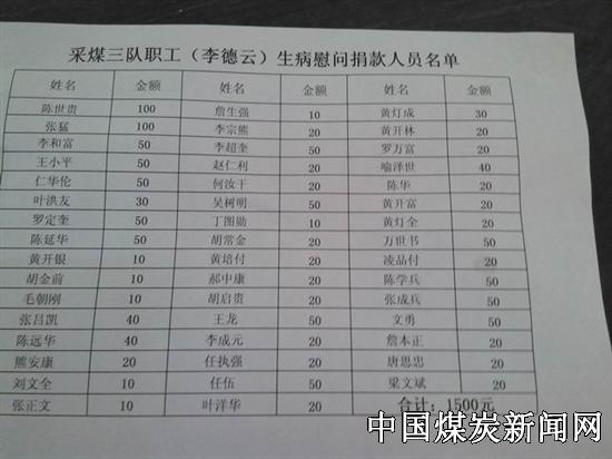 ![]() 今年41岁的袁加云是该矿采煤二队割煤司机,2005年9月到鲁班山北矿采煤二队工作,2014年10月生病到宜宾二医院检查换脑梗塞病住院,在袁加云住院期间,由于袁加云没有结婚,无人员护理,采煤二队党政工及全体职工开会商议,安排采煤二队一职工前去护理,护理人员的工资由采煤二队全体人员承担。两月后袁加云病情好转出院在家休养。可是天有不测风云,最终袁加云在2015年3月15日被病魔夺取生命。家中上有年迈母亲,该队职工纷纷捐款620元, 3月27日,采煤二队工会主席及职工代表送去全队职工对袁加云同志的哀悼及家庭援助之情。 ![]() 采煤三队职工李德云,现年51岁,3月20日因肺病去世。李德云2012年12月到鲁班山北矿工作,家有80岁老母亲、妻子及儿子。2014年12月生病到宜宾二医院检查患有肺病,在宜宾住院两月后转至长宁医院。该队职工在其住院期间及病亡后,对其捐款1500元,表达工友之间关爱之情。2015年3月20日,李德荣因病去世。在其住院期间到病亡后,采煤三队党政工为帮李德云渡过难关,在全队职工中发起捐款倡议,职工们纷纷慷慨解囊,共募集捐款1500元并送到病亡职工李德荣家属手中,虽然杯水车薪,体现采煤三队团结友爱之情。