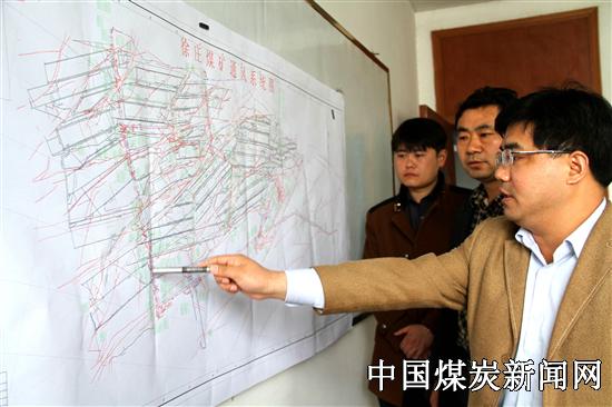 【本网讯】在安全管理上,中煤大屯公司徐庄矿始终把“一通三防”工作作为煤矿安全管理重中之重来抓,采取有效措施,优化通风布局,做到矿井通风系统合理、稳定、可靠,确保安全生产。图为管理技术人员在研究通风布局情况