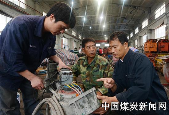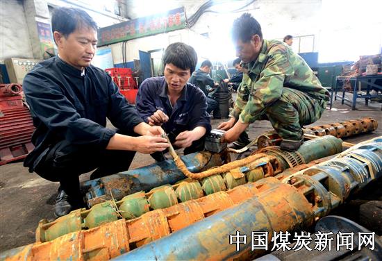 【本网讯】5月29日,安徽皖北煤电刘桥一矿综修厂员工对损坏潜水泵进行“会诊”。面对持续低迷的煤炭市场,这个矿本着“能用旧的不更新,能自修的不外委”,成立技术攻关小组,将以往外修的潜水泵全部进行自修,仅此一项每年可节省费用几十万元。