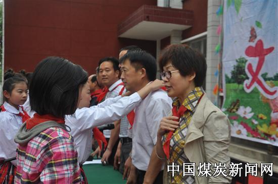 主席台上,少年先锋队队员为郭勃政、周保平等佩戴红领巾,领导和少年先锋队队员互致队礼。