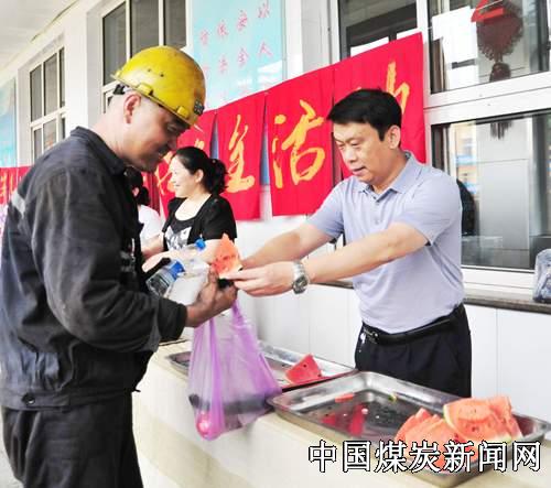 【本网讯】 6月19日中午,冀中能源峰峰集团公司工会送清凉小分队来到牛儿庄采矿公司井口,为上下井职工热情的送上粽子、西瓜、黄瓜、毛巾等慰问品和温馨的祝福,激励了职工的工作热情。