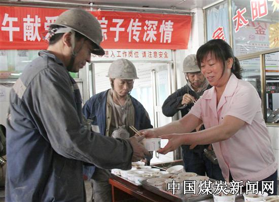 【本网讯】神宁金能分公司工会女工委于6月19日在井口“金太阳”服务站组织开展了“端午献爱心 粽子传深情”活动,由女工委家属协管员亲自把味道香浓、口感纯正的粽子递到上、下井员工的手上,并送上了“节日快乐、安全工作”的温馨祝福与殷殷叮嘱,营造了浓郁的节日气氛。图为该分公司家属协管员在为夜班升井员工盛粽子。