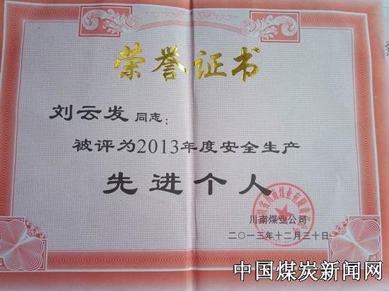 ![]() 在生活方面,对人热情,团结职工,能够和职工打成一片, 是工友们对刘云发的评价。 他经常关心职工困苦,了解职工思想动态。在他的班组有一两个工作不积极、思想活跃、蛮干的员工,刘云发多次找到他们谈心,疏导员工情绪,使班组成员能够放下包袱,轻松上岗,确保了班组安全生产的顺利开展。他常对工友说:“我们来矿上班,上有父母,下有妻儿,亲人们时刻牵挂着我们,下井干活就得讲安全”。