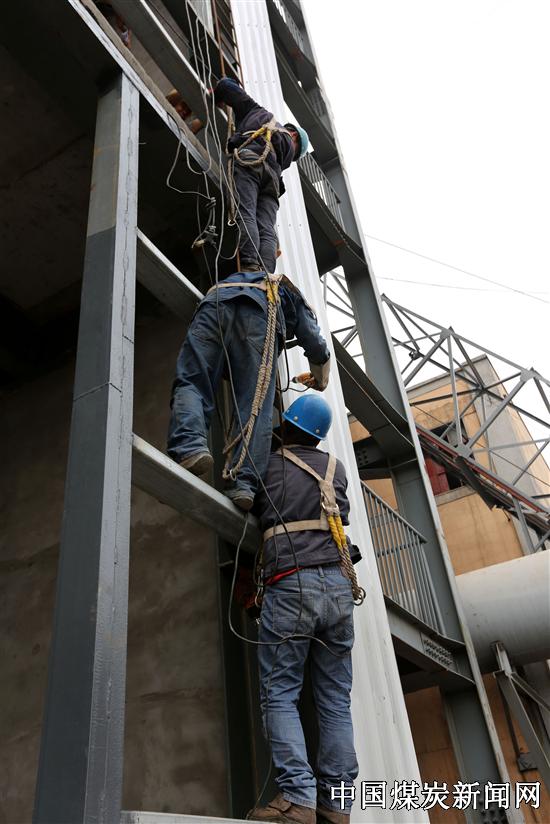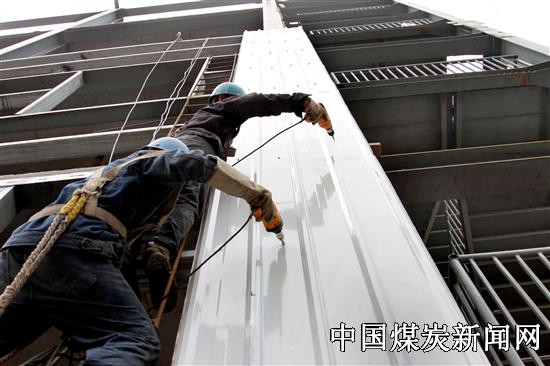 【本网讯】2015年7月23日,位于河南省安阳县铜冶镇的豫龙煤炭焦化有限责任公司密闭合金炉施工现场,河南亿立钢构建设工程安装队的员工顶着摄氏40度的高温,正在33米的高空作业,为主厂房安装J列墙面板。