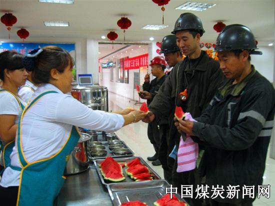 炎炎夏日,酷暑难耐,为充分调动一线员工的生产积极性,同煤集团四老沟矿结合生产实际,持续在井口服务站开展了“送清凉”活动,为出入井的员工精心准备了甜美多汁的西瓜、熬制了绿豆汤、银耳汤等,同时还发放了藿香正气水、毛巾等防暑、消暑用品,切实让员工从心里感受到了丝丝清凉。图为该矿女工安全联保员为员工送上了西瓜。