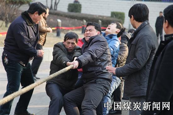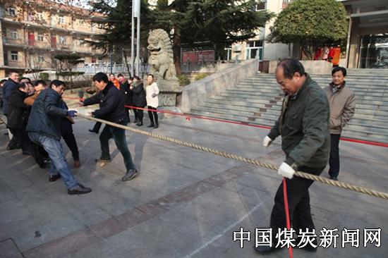 “ 一二 ,加油!一二,加油!。。。。。。”元月5日上午,陕煤铜川金华山煤矿办公大院内热闹非凡,号子声,欢呼声,加油声,响成一片,该矿迎新年职工拔河比赛正在进行。
