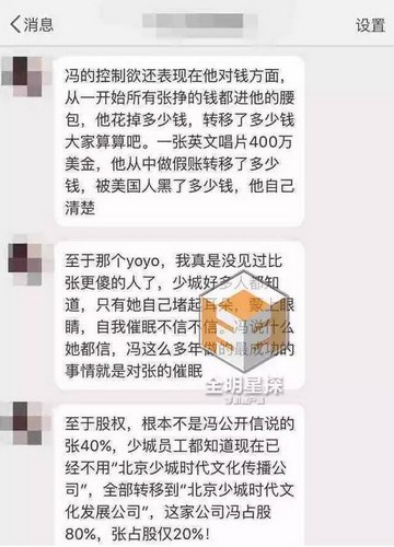 至于网曝的冯轲小三,该爆料人表示属实,并且少城的很多员工都知道,而吴思潇连同她的室友朋友确实都去了宁财神的公司。爆料人称张靓颖总是自我催眠不愿意相信,冯轲这么多年做的最成功的事情就是对张靓颖的洗脑。 该爆料人还表示,冯轲的控制欲还表示在钱的方面,张靓颖挣的钱都进了冯轲的腰包,而那张花400万美金做的唱片全是冯轲自己弄的,公司没有别人参与,所以这张专辑为什么花了这么多钱也没人知情,该爆料人称冯轲或趁机从中做假账将钱转移到了海外。 至于股权,该爆料人表示根本不是冯轲公开信说的张靓颖占40%,少城员工都知道现在“北京少城时代文化传播公司”的资产全部转移到了“北京少城时代文化发展公司”,这家公司冯轲占股80%,张靓颖只占股20%,而冯轲所谓的融资也是融给他占股80%的这家公司。 该爆料人还透露,冯轲没有管理公司的能力,公司已经被他掏空,冯轲说在实现张靓颖的理想,其实是冯轲一直花张靓颖的钱来实现他的影视梦,但因为不懂,亏得一塌糊涂。爆料人称目前少城公司已经换了好几拨财务,还清掉了很多知情老人。 对于张靓颖妈妈公开信中说的张靓颖只有一张信用卡,没有存款,该爆料人表示属实,张靓颖对自己挣了多少钱心中没数,完全活在冯轲给她勾画的世界里。