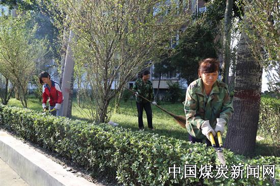 峰峰集团通二矿社区物业科职工修剪辖区内草坪1800平方,绿化带2000余米,实现了造型统一、形状美观,为职工群众提供了舒适优美的工作生活环境。图为该社区职工正在精心修剪绿化带。