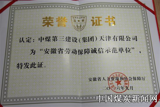 【本网讯】近日,从安徽省人力资源和社会保障厅获悉,中煤第三建设(集团)市政工程公司荣获2016年“安徽省劳动保障诚信示范单位”称号。