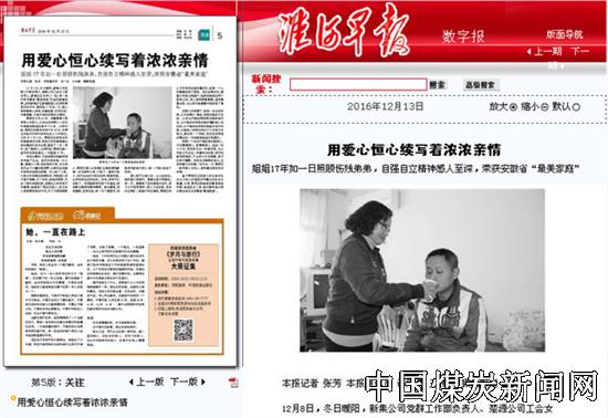 ![]() 12月份以来,中国企业新闻网、中国煤炭网、中国煤炭(煤矿)新闻网、安徽文明网、安徽网、安徽煤炭网、中安在线、淮南网、淮南报业新闻网等媒体争相报道了蒋荷芝家庭的感人事迹。12月13日的《淮河早报》(总第3934期)5版《关注》栏目以《用爱心恒心续写着浓浓亲情——姐姐17年如一日照顾伤残弟弟,自强自立精神感人至深,荣获安徽省“最美家庭”》为题,用了半个版的篇幅进行了图文报道。