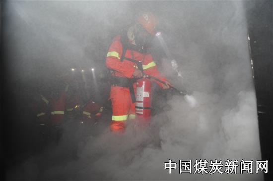 演练一:某工作面回风顺槽发生火灾,要求进行救援。接到“事故”警报后,救援中心立即启动火灾事故应急救援预案,命令两个小队迅速出动,同时命令其它中队待机,形成一方出动整体联动的应急格局。指挥员头脑清晰、指挥娴熟,小队配合默契、行动迅速,随时对有毒有害气体、氧气浓度和温度进行检测,在保证自身安全的前提下开展救援工作。侦查中,发现明火且火势不大,瓦斯浓度为0%、一氧化碳浓度0.06%、温度50℃,能见度不足3米,小队立即采取积极方法,用灭火器、水从火源外围直接灭火。灭火后,对阴燃火进行破拆浇注,对高温区前后30米范围喷洒降温,经检测确认有毒有害气体和氧气浓度、温度均达到《规程》规定的要求后,与矿方进行交接撤出工作地点。