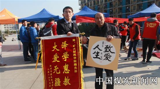 ![]() 下午1点左右,活动接近尾声。胡德鑫老师现场题词赠与材料学院,并有徐州市特教中心周长城主任赠与材料学院烛光体“泽学惠教,大爱无疆”的锦旗。从活动烛光体负责人潘思宇处获悉,进行本次义卖活动,旨在募集资金为徐州市特殊教育中心的盲童们购买围巾、手套等防寒物品,从而间接改善他们的生活水平,并能够在矿大引发广大同学对盲童的关心与关注。