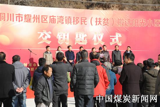 12月16日,陕煤铜川陈家山矿阳光小区移民搬迁交钥匙仪式在此举行,此次活动由庙湾镇镇政委员会、铜川市耀州区庙湾镇人民政府主办,铜川市耀州区移民搬迁办、铜川陈家山矿协办,参加本次仪式的领导有:区政协主席赵乃玲、区人大委员会党组书记杨满收、区政府副区长赵晓峰、区国土局局长雷景豹、陈家山矿党委副书记郝青松、陈家山分公司经理张文明、庙湾镇党委书记左晓兵等。