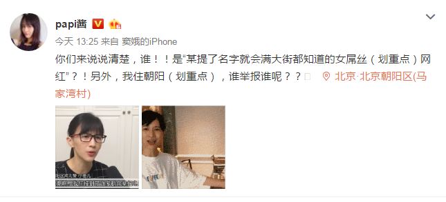 微博截图 原标题:网传北京扫黄牵出网红投资人papi酱:我住朝阳,谁举报谁呢? 近日有报道称,北京扫黄有长江商学院大量投资人和网红被擒。其中,“某提了名字就会满大街都知道是谁的女屌丝网红。”被网友猜测为短视频红人papi酱。对此,@papi酱发微博表示,你们说清楚。我住在朝阳谁举报谁呢?