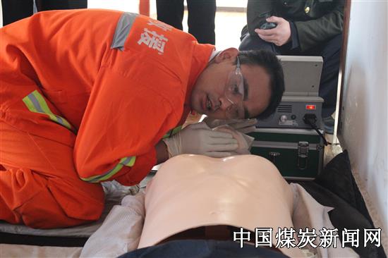 “某矿发生火灾事故,现场发现一名遇险人员,面部有擦伤,双手轻度烧伤,左小腿被冒落矸石砸伤,开放性骨折,命你队迅速前往救治。开始!!!”随着裁判员一声令下,只见急救小组的主操手按照程序,带领急救组从发现伤情到救治伤员完毕,计时器定格在4分38秒,时间又提前了5秒,前来观摩的兄弟单位为这位主操手竖起了大拇指。