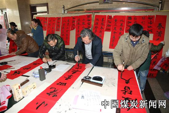 【本网讯】腊月二十三是我国传统的小年,当天一大早,晋煤集团寺河矿书法爱好者就来到井口,举办现场写春联送春联嘱安全活动。书法爱好者们争先挥毫泼墨,将新春的祝福安全的嘱托浓缩成火红的春联,送到一线职工手中,一幅幅飘着墨香充满喜庆的红色春联,伴随着声声祝福,让百里矿区呈现出一派喜悦的节日氛围。图为该矿书法爱好者为职工写春联送祝福。