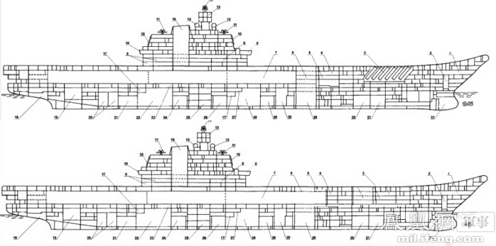 图上为“库兹涅佐夫”号航母侧视线图,下图为设想的001A型航母侧视线图,001A型航母在去除航母发射井结构后,机库可像前整体拓展15米左右,机库面积增加10%左右。(凤凰军事) 尽管中国新航母建造进度未过半,但船坞码头上的1架歼15与直8模型却预示该航母的建造已取得的另一个不为人知的里程碑式成果,那就是机库已基本完工并开始调试。众所周知,航母建造现场是相当拥挤繁杂的,谁也不会在船坞边上放上两架毫无用处又极其占地的舰载机模型,能说得通的解释或许只有目前机库已完工,内部需要进行尺寸细节调整,并对机库末端的舰载机转向盘等设备进行调试。而对于中国新航母而言,其机库结构究竟相比“辽宁”舰进行了怎样的调整?是否去除了舰体前段的导弹发射结构,前移舰体其他结构从而拓展机库面积?这些都直接决定了新航母究竟获得了多大的以舰载机搭载数量为代表的核心战力提升,而随着机库的完工,所有的争论都已有了结果。 对于“辽宁”舰船体前段的导弹发射结构,中国仅做了封闭处理。而在漫长的“辽宁”舰续建过程,甚至在对更早的“基辅”号与“明斯克”号航母进行整修的过程中,中国就已在探索在成品与设计上对苏式航母进行改进升级。因此在中国新建航母上,导弹发射结构无疑将被去除,而参照小编在2015年12月31日的“凤凰军评”中所阐述的那样,新建航母可通过将导弹发射结构与机库间的舱室整体前移至导弹发射结构,从而使机库结构向前拓展,载机空间将比“辽宁”舰增加10%左右。即使仍装备滑跃甲板,但仅仅这10%的机库面积增加,就足以令中国新建航母超越“库兹涅佐夫”号航母与英国“伊丽莎白女王”级航母,成为整体战力仅次于美国航母的恐怖战舰。 当今中国在发展航母时,即没有当年苏联的那种短暂而强烈的对航母战力的无知狂热,也没有非军事、非技术要素对航母设计建造的干扰,因此中国未来发展出远超苏联直逼美国的航母战力是理所应当的。