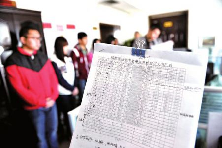 随后,“袁老师”从数套准备好的试卷中抽出一份交给应聘人员,要求在2小时内答完,当场批改。满分100分,成绩55分以上均为合格。“袁老师”会在另一份表格中进行登记。