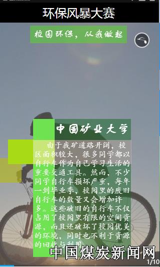 【本网讯】5月27日,中国矿大化工学院环保风暴大赛在经过评分、投票后从参赛作品中评选出了一部分优秀作品并在QQ及微信平台上进行展示。