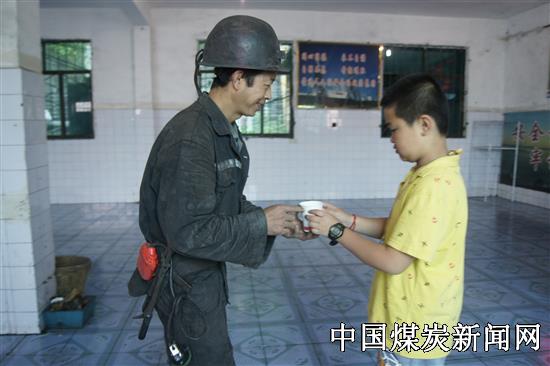 在井口,可爱的小朋友们为矿工叔叔们送上一杯杯装满祝福的热茶,用亲切的话语叮嘱大家工作中一定要注意安全,让大家感受到亲情的温暖。