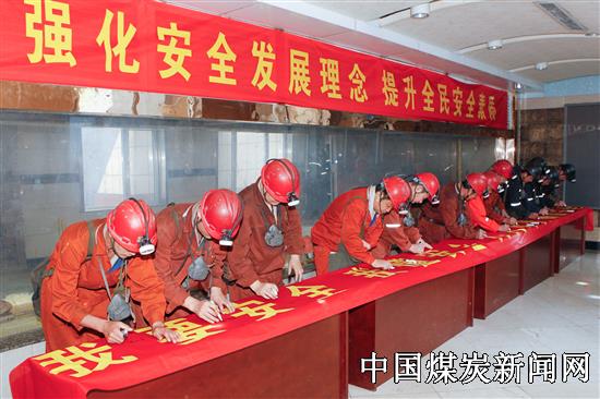 :在全国第15个安全生产月到来之际,山东能源临沂矿业集团新驿煤矿于6月1日上午,在副井口举行了安全月启动仪式,该矿一千余名矿工在“强化安全发展观念,提升全民安全素质”的长幅标语上郑重的签下了自己的名字,表达了对矿井安全生产的期盼和庄严承诺。