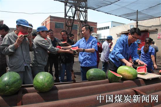 【本网讯】连日来,持续的高温天气给坚守在生产岗位的广大干部职工带来了“烤”验。为此,中国平煤神马集团一矿开展了多种形式的“送清凉”活动,在炎炎夏日为职工送去了丝丝清爽和浓浓关爱。图为6月28日,该矿综合修造厂为支架车间露天作业的职工送去了西瓜,切实把防暑降温工作落到实处。