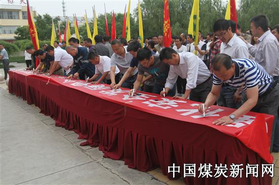 启动仪式上这个矿组织人员进行了军事队列表演和准军事化班前会模拟表演,启动仪式最后,全体员工踊跃在“强化安全发展观念、提升全民安全素质”的横幅上进行了签名。
