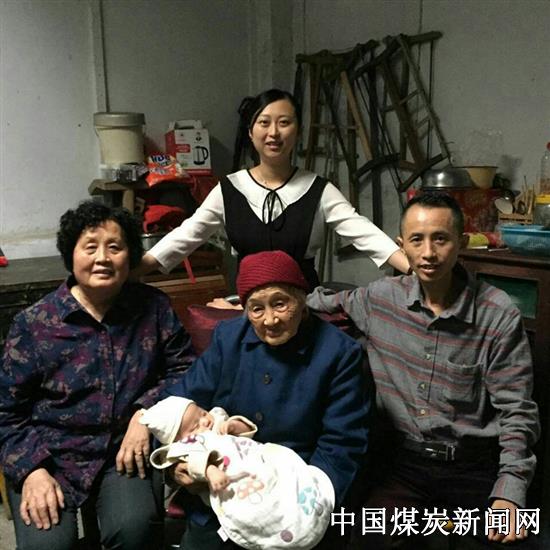 【本网讯】在四川省威远煤矿老明槽居委会居住着幸福五世同堂的一家人。原威远煤矿采煤工董明光,1964年因煤肺病去世,其遗孀熊淑芳在党和政府的关怀和儿孙晚辈的精心照顾下,现已99岁,一家人儿孙满堂20多人,有退休教师、工程师、公司白领(其中大学毕业生8人)。现该老人耳聪目明、头脑清醒,可喜的是今年3月25日,其曾孙又生一子,进入了这个大家庭,成为名副其实的五世同堂、其乐融融。