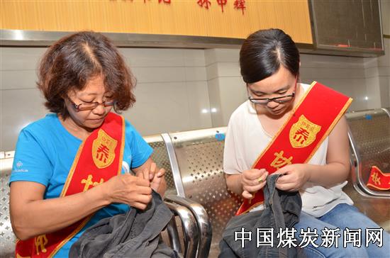 【本网讯】7月以来,山东能源淄矿集团许厂煤矿协管会始终围绕“关注安全,真情服务”这一理念,扎实开展服务活动,组织女工家属协管员到区队、井口、车间等地点,为生产一线职工送解暑绿豆汤、清凉扇、嘱咐安全话语、缝补工作服等,“用我真情,筑你安全”,以“真情”感召职工搞好现场安全生产。图为7月19日该矿女工协管员在为井下职工缝补工作服。