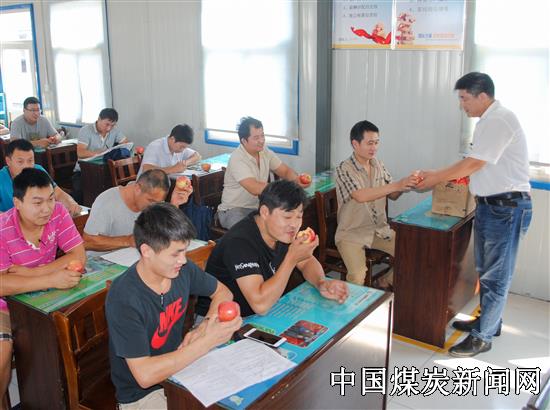 淄矿集团许厂煤矿综掘二队党支部精心购买了大红苹果,在班前会上免费发放给职工的同时,提醒广大职工节日期间,遵章作业、牢记安全。图为9月10日,该队党支部书记吴共民给职工送上苹果。