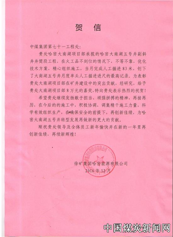 【本网讯】日前,徐矿集团哈密能源有限公司发来贺信,祝贺中煤七十一处在大南湖五号副斜井井筒施工中,12月份人工掘进进尺83米,创大南湖五号井月度单头人工掘进进尺的最高纪录。