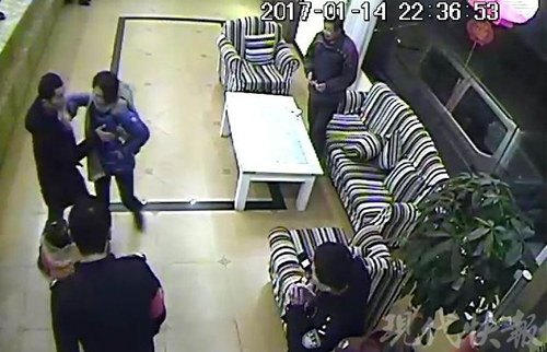 监控截图 原标题:女子刀架脖子拍照发给老公 逼其回娘家过年(图) 近日,家住连云港东海县的单某与妻子陈某因回双方父母那边过年引发了争执,为了达到回娘家过年的目的,陈某先闹失踪,后寻短见,幸亏民警及时控制、调处,避免了闹剧向悲剧的转变。 1月14日晚22时许,单某带着两个孩子急匆匆到东海县公安局牛山派出所求助:“我老婆和我闹别扭了,现在发微信图片过来,手里拿把刀,要自寻短见!”派出所值班领导立刻进行调查,很快发现陈某在东海县城区的一家宾馆内,随即指派在附近的巡逻民警赶赴现场。 为了彻底解决隐患,民警又带着陈某、单某到派出所进行调解,经过耐心工作,陈某向民警吐露其是四川省人,因回娘家路途遥远,一年才在过年的时候回一次娘家,但是今年丈夫就是不同意去她娘家过年,还将她买的火车票藏了起来。一气之下,她才上演以上的一幕。经过近2个小时的耐心调解,陈某、单某某夫妻二人各自把长时间积攒下委屈都说了出来,经过民警的评判,各自都认识到自身存在的问题,才得以把这些夫妻间的“疙瘩”解开,陈某表示将理性解决生活矛盾,夫妻二人感谢民警的热心救助。在敲开陈某入住的宾馆房间后,民警发现房门上了保险链,为了不引起陈某的警觉,宾馆保安以谎称检查房间内物品有无损坏为由,骗开房门。陈某发现进入房间的民警及其丈夫单某后,迅速拿出一把水果刀大喊:“你们退后,别过来,要不然我就自杀!”,情绪非常激动。为了确保陈某的安全,民警耐心做陈某的思想工作,以陈某的家庭环境入手,让其知道其作为母亲的责任,作为子女的义务;而后让其珍惜生命,珍惜现有的生活环境,遇到困难更要自强自爱。经过反复工作,陈某思想有所松动,但仍握紧水果刀不放。为了转移陈某的注意力,民警劝说其离开房间到外面解决家庭矛盾,陈某在劝说下拿着水果刀进了电梯。在电梯间的狭小空间内,民警终于可以靠近陈某,趁其不备,民警和辅警果断抓住陈某双手,最终将陈某手中的水果刀夺下。