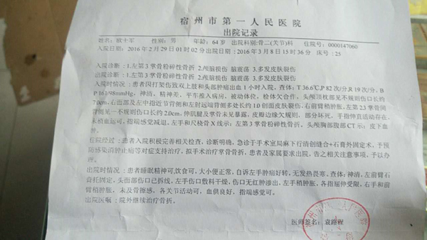 欧士军于2016年2月28日晚在家中遭蒙面歹徒入室殴打致身上多处受伤。 本文图片均为欧洪波供图 据欧洪波称,2016年2月28晚10点左右,两名蒙面歹徒手持钢管,砸烂门窗进入其位于宿州市埇桥区符离镇梁套村家中,其父被打晕,歹徒扬长而去。 宿州市第一人民医院出具的出院记录显示,欧士军2016年2月29日凌晨1时许入院,经诊断,欧士军左第三掌骨粉碎性骨折、颅脑损伤、脑震荡、多发皮肤裂伤。