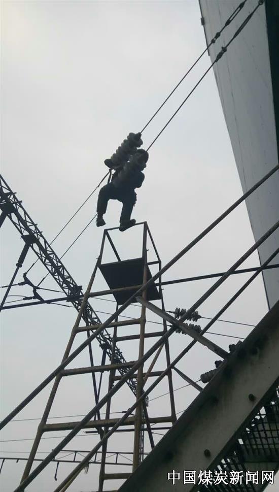 2017年元月6号,由于同煤集团塔山铁路分公司集运站装煤仓冬季喷洒防冻液,风力较大,导致防冻液散落在了筒仓附近的绝缘子上,造成了绝缘闪络,危及了接触网供电设备。公司领导得知这一情况,立即召集抢修队员,申请停电作业令。抢修队队员爬上六米的高空对绝缘串进行清洗。由于时间短,任务重,每个队员都积极踊跃的投入到工作之中,不顾晚间天寒风吹,队员们却干得火热朝天,抹布“冻僵了”,他们仍然顾不上冻的通红的双手,继续擦试。手冻得伸不展,他们就用嘴哈这热气,经过近一个多小时的努力,送电成功了,他们露出了笑容可他们的衣服已经湿透了,双手已经冻的伸不出来了。