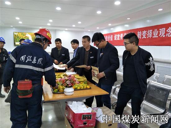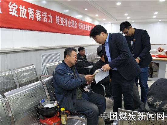 四老沟矿青年就业中心在井口服务大厅开展了“奉献岗位价值,绽放青春活力,转变择业能力,提高就业能力”井口慰问活动,此次活动,共组织为出入井员工发放就业信息300多份,答疑解惑40余条。图为该矿青年志愿者为出入井员工现场讲解就业渠道和用工信息。