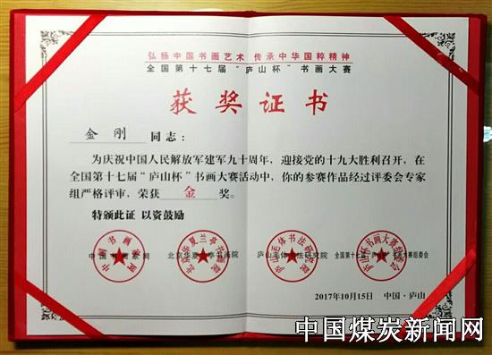 | 煤矿书法家金刚荣膺全国第十七届“庐山杯”书画大赛金奖 | |||