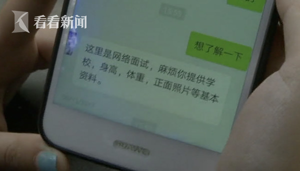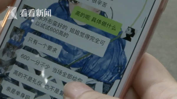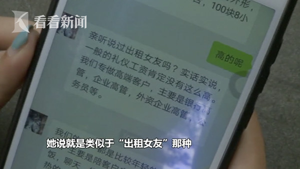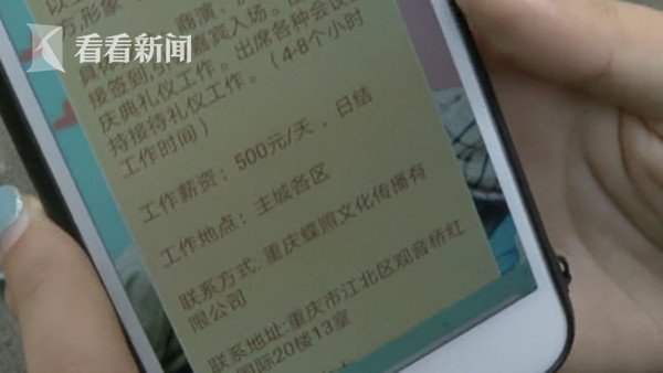 小张是一名大一新生,刚上大学的她,希望能够在学习之余,找一份兼职,一方面减轻家里的压力,同时也可以积累一些社会经验。前几天,她在群里看到一则招聘商务礼仪的信息。鉴于薪水较高,小张联系上了自称王姐的负责人。 在网上,王姐首先要求小张提供个人照片和身份信息,随后,她告诉小张,公司提供低报酬和高报酬两种兼职,低的就是一般的礼仪,不看外形,100块钱8小时,另一种则是500块钱一天。 小张:“我说这种是哪种活动呢,她说就是类似于“出租女友”那种,就是先陪客户聊天,然后有可能周末就陪他们出去耍会,吃饭啊,聊天啊,还有可能有亲密的动作。” 小张越聊越觉得不对劲,心里也有些害怕,于是便以性格内向、不擅长交流为由,拒绝了对方。但是,王姐似乎看出了小张的担忧,仍然不断地劝说小张。 小张:“她说你在怕什么,她说有很多女学生都跟着我做的,她们现在月收入成千上万的。她说跟我一路,包你找得到钱。她就是针对我们这种群体来安慰的。” 虽然小张再三拒绝,但这位王姐还是让一位自称客户的人加了小张的联系方式。最终,小张不堪其扰,删掉了那个王姐和客户的联系方式。 通过招聘信息,记者看到,这家文化传播公司,位于江北区观音桥红鼎国际20楼13室,但是,当记者寻着这个地址来到红鼎国际时却发现,这里并没有13室,也找不到这家公司。随后,记者在工商部门的公开信息里看到,这家公司注册的地址,是江北区渝北三村三十号,而这个地址对应的,就是红鼎国际。随后,记者又拨打了招聘信息中的电话,号码却是空号。 由于地址和电话都无法找到对方公司的人,记者只好以大学生的身份,通过网上联系上了负责人王姐。 和小张一样,在提供了照片和身份信息后,王姐开始介绍两种价位的兼职工作,王姐表示,如果愿意做出租女友,那么费用标准是600元钱,工作时长为4小时。 当问到亲热到什么程度时,王姐便再没有进行正面回答了。随后,对方还表示,公司要求“出租女友”必须是单身,最好有恋爱经验。当记者表示担心时,王姐是这样安慰的:“亲,我们的客户都是银行和金融圈的,都是中高管。客户是有身份,有地位的,很注意保护个人隐私。相信姐姐,跟着姐姐干,每个月赚几千,甚至上万。” 答应之后,王姐推荐了一位客户,并添加了记者的联系方式。在聊天中,对方声称自己是某银行的部门经理,除了提供金钱,今后还可以提供职业上的帮助,也就是说,只要愿意答应对方的要求,那么金钱、前途都可以高枕无忧了。 当问到在一起后,需要做什么时,客户表示,一个月见5、6次面,对方就提供3000元零花钱。这位客户还向记者透露,自己是通过朋友介绍,找到这家公司的,而之所以找“出租女友”,是因为这样能缓解工作压力,让自己开心。 聊天过程中,王姐和客户都不断地从金钱、前途、安全性等方面进行劝说,并表示:“出租女友”是一个再正常不过、而且有益无害的工作。对于这样的兼职,小张表示不耻和厌恶。 小张:“我就觉得以后找兼职要通过正规途径找工作,不要随便看到一个消息就上了,我怕以后也会有安全问题。” 由于采访过程中,记者始终没能联系上这家公司,网上的招聘,是否真是这家公司的行为,还是有其他人在冒名从事这样的活动,暂时无法查清。大学生小张表示,如果有必要,她会向工商、公安等部门反映这一情况。