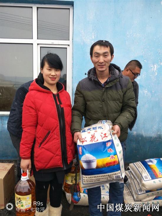 【本网讯】龙煤集团向阳矿五井90502掘进班长夏文举今年以来,带领小班职工开展安全高效竞赛活动,1---10月实现安全超产,在矿召开表彰大会上妻子孙明明和老公一起登上领奖台,妻子孙明明说;“老公的奖励我作为妻子当然开心光荣。”图为夫妻两人高兴领矿奖励的豆油、大米