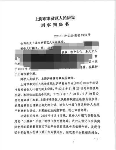 叶榅飞一审判决书。受访者供图 律师吴绍平回忆,会面时,叶榅飞始终在问:欠钱还了就好了,真的要被判刑? 叶榅飞是福建人,在上海生活多年。去年6月,在使用一款名为“壹钱包”的金融理财软件时,叶榅飞发现,存入的钱被退回银行卡内,但软件上的账户余额却相应增加。此后8天,叶榅飞利用这一故障,前后转账超过350次,套现1125万元。 “壹钱包”平台运营方报警后,叶榅飞被警方拘留。近日,叶榅飞的辩护律师吴绍平收到该案一审判决,法院以盗窃罪判处叶榅飞有期徒刑11年,并处罚金50万元。叶榅飞妻子昨日接受新京报记者采访时表示,丈夫并非主动侵入系统盗取资金,而是利用产品漏洞牟利,并据此提出上诉。 发现漏洞后转账350余次 8天时间里,叶榅飞转了350多次账,每转一次,就意味着得到一笔“意外之财”。 2015年6月16日,叶榅飞下载了理财软件“壹钱包”,并注册激活。当年9月10日,叶榅飞用妻子黄丽丽的证件和手机号码,以黄丽丽的名义,办理平安银行(13.180,0.08,0.61%)“花漾卡”,并与“壹钱包”账户关联,用于后者的转账和消费。 “壹钱包”客户端由平安付科技服务有限公司(下称平安付公司)推出,花漾卡则是平安付公司与平安银行共同推出的互联网信用卡,与普通借记卡或信用卡有别的是,花漾卡没有授信额度,也没有透支功能,使用额度等于“壹钱包”账户余额。 2016年6月4日晚,叶榅飞通过名下一张借记卡,向“壹钱包”进行转账充值时发现,资金转入不久便被退回转出卡,但“壹钱包”关联的花漾卡账户余额却相应增加。叶榅飞又试了几次,都出现了同样的状况。 转一次钱,就可以套出一笔同样金额的钱,这个“发现”让叶榅飞有些兴奋。此后一连8天,他沉溺在这种转账-退回-余额增加的过程中。叶榅飞没有计算过转账次数,警方事后的调查,将这一数字固定为350次以上。 极度频繁、连续的交易,让“壹钱包”运营方平安付公司有所察觉。平安付公司事后的报案材料显示,6月12日,平安付公司发现黄丽丽账户异常后,曾与黄丽丽电话沟通,确认所有操作由叶榅飞完成。随后,平安付公司报警,叶榅飞于2016年7月被刑事拘留,9月1日被逮捕。 一审判刑11年 罚金50万 警方查明,8天时间内,叶榅飞的转账总额达到1125.64万元,其中884万余元被用于购买平安银行理财产品,241万余元用于购买黄金、归还债务,并购买了奥迪A4和A6轿车各一辆。 案发后,平安付公司将叶榅飞名下884万余元理财产品以及账户余额、理财产品利息等冻结。黄丽丽偿还了29.6万元,但仍有约206万元无法给付。 平安付公司的报案材料证实,2016年6月2日至12日,“壹钱包”的还款渠道系统曾出现问题。 2016年11月25日,上海奉贤区检察院以盗窃罪对叶榅飞提起公诉。之后,奉贤法院分别于6月和9月两次开庭审理。近日,叶榅飞的辩护律师吴绍平收到该案判决书。 奉贤法院一审判决书显示,庭审中,叶榅飞对指控的事实、罪名均有异议。叶榅飞的辩护人同样提出,其在主观上没有非法占有的目的、客观上没有实施秘密窃取的行为,属于民事范畴的不当得利,不构成犯罪。 奉贤法院并未采纳这一辩护意见。法院认为,叶榅飞以非法占有为目的,秘密窃取公私财物,数额“特别巨大”,已触犯刑律,构成盗窃罪。 法院称,叶榅飞明知银行卡支付系统出现故障,仍反复操作并取款,“依法应予惩处”。由于叶榅飞在家属帮助下退赔部分赃款,“可以酌情从轻处罚”,判处有期徒刑11年,并处罚金50万元。此外,叶榅飞及黄丽丽未偿还的近206万元,也需退赔。 对话 叶榅飞妻子:不是主动侵入系统偷钱 昨日,叶榅飞妻子黄丽丽在接受新京报记者采访时表示,已经提出上诉。她称丈夫出事后,自己查询才发现,丈夫名下有各种欠款。她希望法院在二审时考虑到平台自身的责任,予以从轻判决。 新京报:叶榅飞为什么不用自己名义绑定账户? 黄丽丽:具体情况我也不是很清楚,我们家里的钱,一直是他做主。好像是他名下有贷款和欠款,没有办法办理,所以都是用我的名义办卡,但是一直是他在用。 新京报:什么时候知道叶榅飞在利用漏洞套现? 黄丽丽:他主动告诉我的,我之前没有过问。知道这个事后,我有点慌,说这是犯法的钱,不能用,他说跟那边客服商量,准备分期把钱还了,我就没有太在意。 新京报:买了这么多东西,你没有察觉到异常? 黄丽丽:他消费从来不会跟我商量,我们以前就是这样。经济来源是他,我也不知道家里挣多少钱,所以我也不会问。而且,银行绑定的手机卡,虽然是我的名义申请,但还是他在用,所以我也没看到扣款短信。 新京报:家里现在的经济状况怎么样? 黄丽丽:生了孩子后,我就在家里没有出去工作。因为以前一直没有管过钱,出事之后才发现,叶榅飞的信用卡、各种借贷软件、白条上借了一大笔钱,都需要还。现在就是跟家里人借钱过日子,然后白天在亲戚开的美容院帮忙。 新京报:怎么看待现在的判决? 黄丽丽:我一直以为把钱还上就没事了,毕竟是系统出了问题,不是我们主动侵入系统偷钱用。但是没想到会被判刑,感觉还是比较重的。 新京报:对于上诉有什么想法? 黄丽丽:转账系统出现漏洞,这个事上,双方都有责任吧,希望二审的时候考虑这一点。在进行处罚时,平台和我们双方共同进行承担。 追访 律师:适用法律正当 但可争取减刑 一种声音认为,叶榅飞的行为,主观上没有非法占有目的,客观上没有实施盗窃行为,属于民