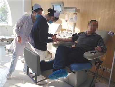 11月17日,燕郊一献血屋门口,“血头”(右)向患者家属(中)及献血者(左)交代献血事项。 11月16日,燕郊一献血屋采血室内,一名白血病患者家属正在进行“互助献血”。 11月16日,燕郊燕达陆道培医院,因为肠道排异反应,10岁的白血病患者萱萱(化名)躺在病床上输液,其母亲在一旁照顾,父亲则透过门缝看孩子一眼。A08-A09版摄影/新京报记者 大路 燕郊燕达陆道培医院聚集了数百名白血病患者在此治疗。由于患者用血需求量大,有血头长期盘踞医院,从网上招聘献血者来燕郊,以“互助献血”的名义“卖血”,每个单位血小板向患者收费五六百元。 血头现象的背后,是大量需要长期输血的燕郊白血病人。因为用血无法得到保证,他们除了找血头,也尝试了其他办法,如患者之间互借血小板以解一时之急。 没有家属不同意出借。借了血小板的家属,也会抓紧一切时间还上。他们欠的不仅是一个血小板,有可能是一条命。 当地血站以及医院表示,用血缺口最好的解决办法,依然是呼吁无偿献血,尤其是对血小板的捐献。 11月16日晚,张磊又接到了“血头”电话。在找了十多个人都不合格后,对方终于找到一位血型匹配的献血者。 次日的献血完成后,血头把采血通知单送到了医院。看在张磊是“老客户”的份上,这次采集的两个单位血小板,血头只收了850元。 11月19日,一个单位的血小板输入张磊10岁女儿萱萱体内。另一个还给了其他病友。 在燕郊燕达陆道培医院,患者之间的“借板”(借用血小板)普遍存在。因用血无法保证,数百名白血病患者开始了长期的互助式救助。 白血病患儿每天需输血 萱萱5岁时被确诊为急性髓系白血病,化疗起效后去年又复发。为给萱萱治病,张磊和妻子辞了工作,从兰州到北京,再转到燕达陆道培医院。 今年3月份到医院化疗后,医生表示5月份可以移植。但因为经费问题,一直拖到7月。 7月26日,萱萱终于进舱移植造血干细胞,张磊是供者。术后效果很好,新的血液开始在萱萱体内流动,张磊觉得女儿重生了。 9月29日,萱萱开始出现腹痛,被发现存在肠道排异反应。萱萱的大便渐渐从黄色变成黑绿色,再到褐色,最后变成血红。 由于肠道排异,萱萱近两个月没有吃东西,靠输营养液维持。她脸色苍白,腿瘦得皮包骨头,体重只有30公斤。 一开始,需要隔两天给萱萱输一次血(血小板和红细胞),10月15日之后,萱萱几乎每天便血。输血也成了每天必须。 燕达陆道培医院是一家针对各种血液疾病治疗的专科医院。住着约500名血液病患者,大多数患者造血功能差,需要长期输血。 一般情况下,患者如需用血由医生提出申请,再由公共血库进行分配,医院分配时根据用血的紧急情况有所侧重。 张磊说,每天医院分配用血时,优先血小板量最低的病人。萱萱的血小板一般50以上,根本排不上。 萱萱还是便血。 11月16日早上7时许,她拉了320克血。当天下午和夜里,又拉了300克血。 “一个孩子拉这么多血怎么受得了。”张磊很心疼。一位白血病患儿因缺血导致脑瘫的事,让他非常害怕,他担心一个不小心,之前所有的努力都白费了。更重要的是,女儿聪明懂事,他们舍不得放弃。 当天,医生安排给萱萱输了一个单位的血小板以及400cc血红蛋白、300cc血浆。张磊听医生说,这几乎是每天的标配,如果出血严重还要加量。 红细胞好找,但血小板难求。他又想到找血头。 他第一次找血头是今年4月。萱萱化疗期间需要用血,医院的“公共板”(公共血库血小板)约不到,他通过病友介绍找到了一名血头。在血头找来的人完成献血后,张磊松了一口气。 萱萱化疗时,张磊每半个月找一次血头。移植手术后,他几乎每天或隔一天就得找血头。 11月16日早上,原本约好的一位献血者临时反悔,张磊又联系了三位血头,但都没找到献血者。 11月17日,由于出血严重,萱萱打了止血药,花费3万多元。 张磊说,在医院输一次血小板要两千多,血红蛋白一千多,血浆五百多,相比于一次数万元的止血药,最好的方式还是保证萱萱缺血时能输上血。 他手里存着三四个血头的号码。从4月份至今,他找血头互助了近30次血小板。 多名患者家属向血头买血 不止张磊,医院许多患者都找过血头。 40岁的刘英进舱移植后20多天,血小板一直下降,“公共板”一直约不上,丈夫陈强担心她出意外,想尽办法为她找血。 今年5月刘英发烧不退,到医院检查出白血病。起初在徐州当地医院化疗后,效果不理想,辗转来到了燕达陆道培医院。 又进行一次化疗后,9岁的儿子作为供者,为她进行了移植。 一米六五高的刘英,体重从128斤降到了100斤。陈强给她剃了头发,为了不让她难过,自己也剃了,陪她一起光头。 刘英虽然移植成功,但细胞长得慢,造血功能没有完全恢复,有时一天需要输四个血小板维持指数。陈强想,眼看病就要好了,一定不能在输血这块耽误了。他开始寻找血头献血。 来自湖南的孙乐这一周也忙着给女儿找血。 11月13日晚,孙乐的女儿因胃出血,吐了血丝,先输了血浆。晚上12时许,又出现胸紧、喘不过气的情况,医生抢救后,当天为她安排了一个公共血小板。 “孩子血小板只有30,还每天往下掉。”说着说着,孙乐的眼圈红了。女儿只有7岁,2岁得病,目前刚做完移植。 孙乐是供者不能献血,血头找到的人,不是血压高就是转氨酶高或血液油腻,好几个都不合格。14日,她叫来了正要备孕的妹妹献血,但15日,她还得继续找血头。 来自新疆的冯炎1